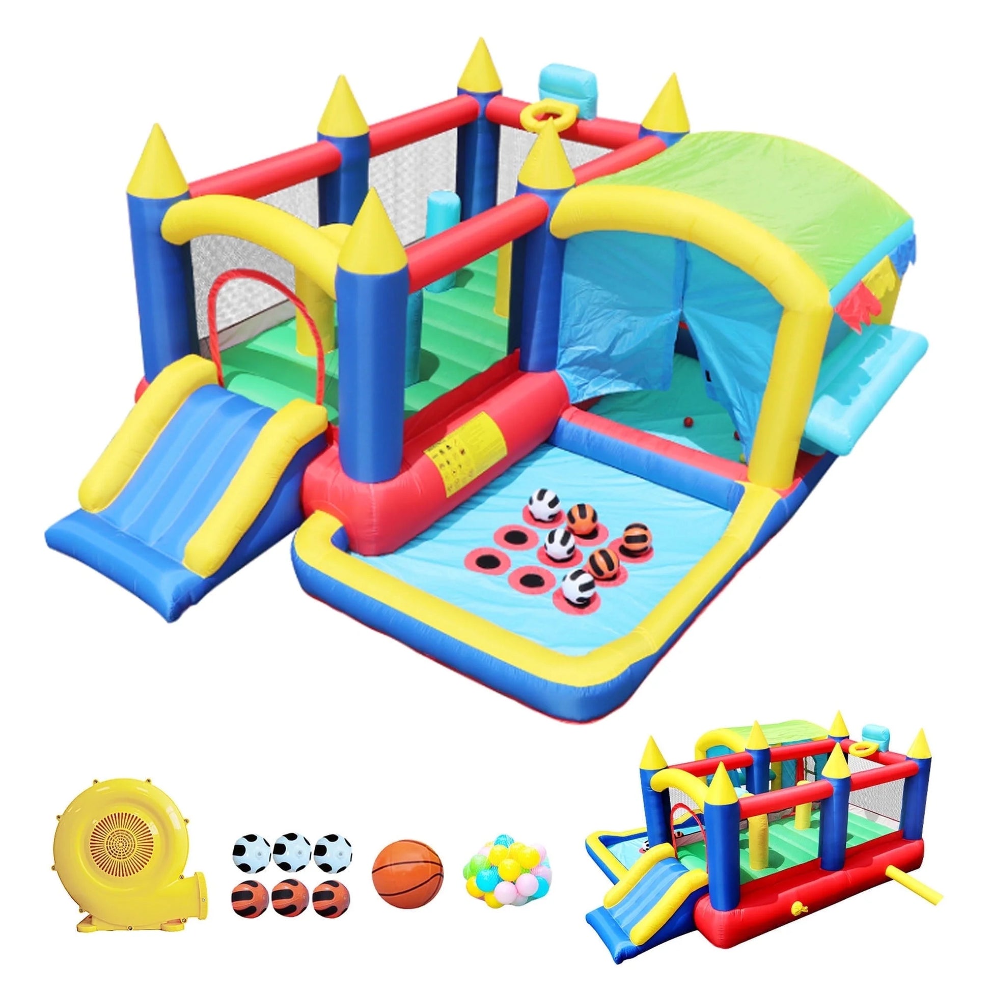 8-in-1 Adventure Park:Jump, slide, climb & shoot! This kids bounce house features an inflatable trampoline, 1basketball hoops, obstacle course, dual-use ball pit or water pool, and a curved inflatable slide—all in brightly colored bouncy castle design.