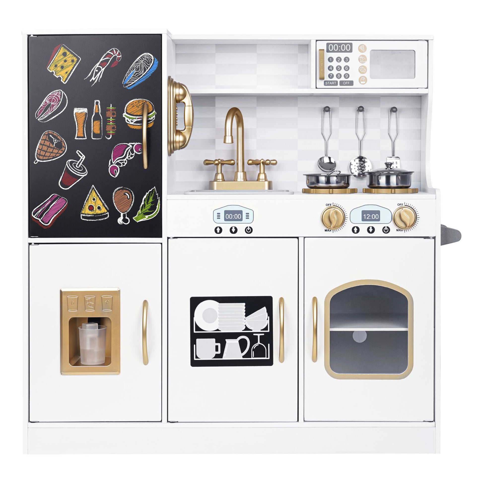 Introducing the COCLUB Espresso Kitchen Playset, the perfect choice for young aspiring chefs eager to whip up a family feast! Crafted with durable wood, this delightful kitchen set offers endless imaginative play and years of enjoyment. It features a realistic stovetop burner with twist buttons, a working faucet, an ice cube maker, an oven with a window, and convenient cabinets. Your little one will love the spice rack, telephone, 5-piece utensil set, microwave, sink, blackboard, and towel rail, all designed to inspire creative thinking and storytelling. Watch as your child becomes enthralled in cooking adventures, creating lasting memories with every play session.