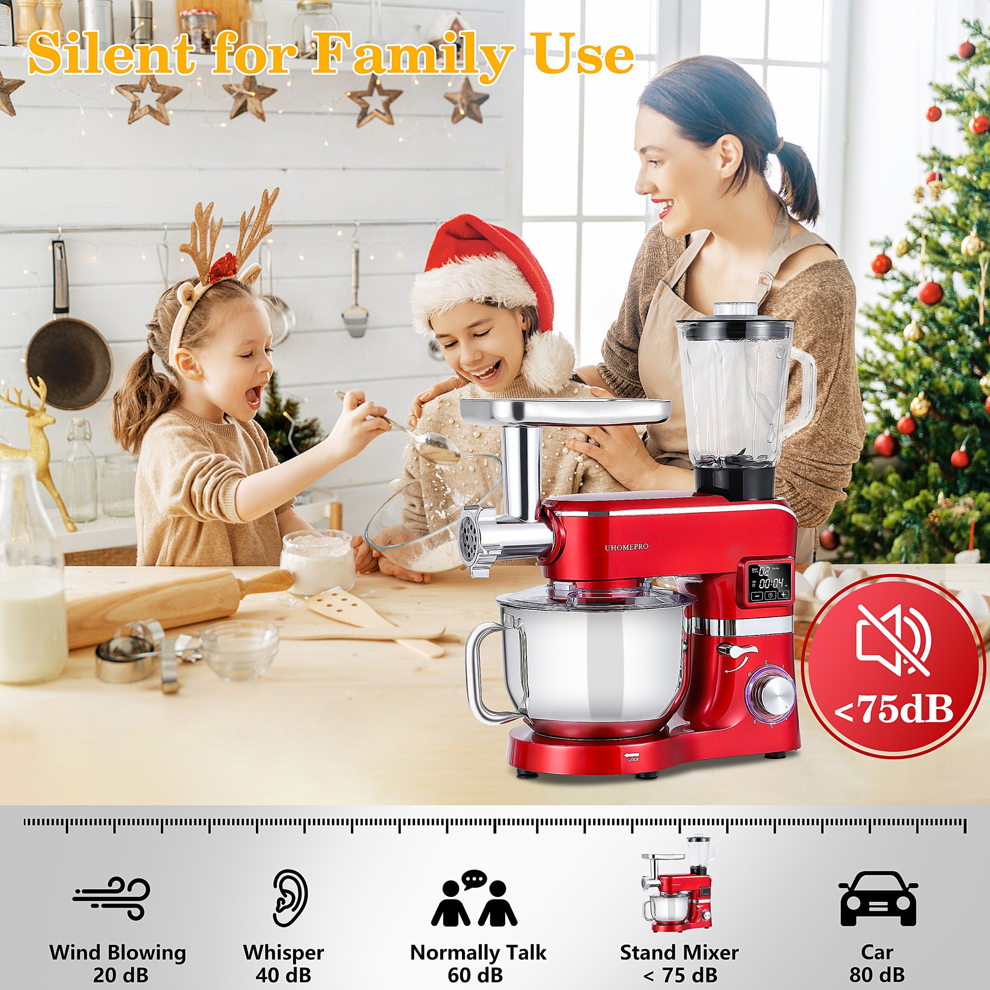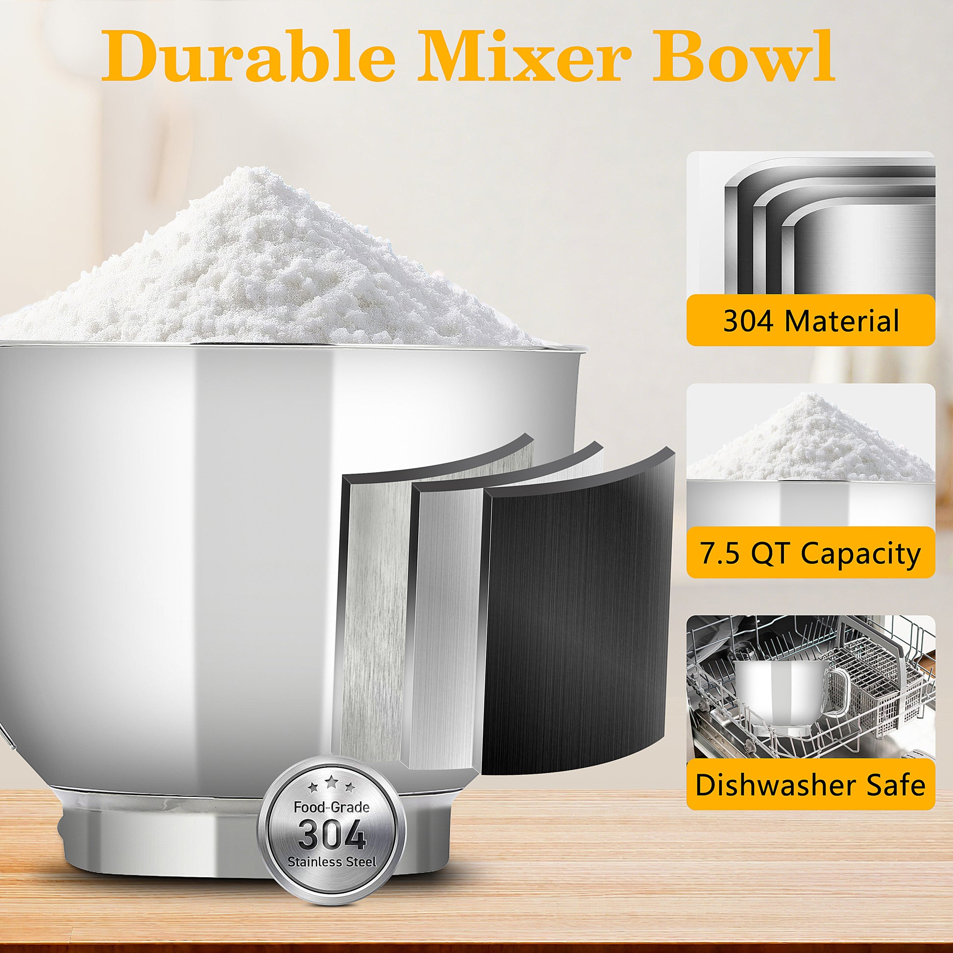 TILT-HEAD DOUGH STAND MIXER - The tilt-head design allows clear access to the stainless steel bowl and attached mixing attachments, convenient to install and remove. The splatters shield guards against messy drips drop, and spills. The anti-slip legs keep the food stand mixer stable and safe during operation, avoiding movement or bouncing to reduce noise.