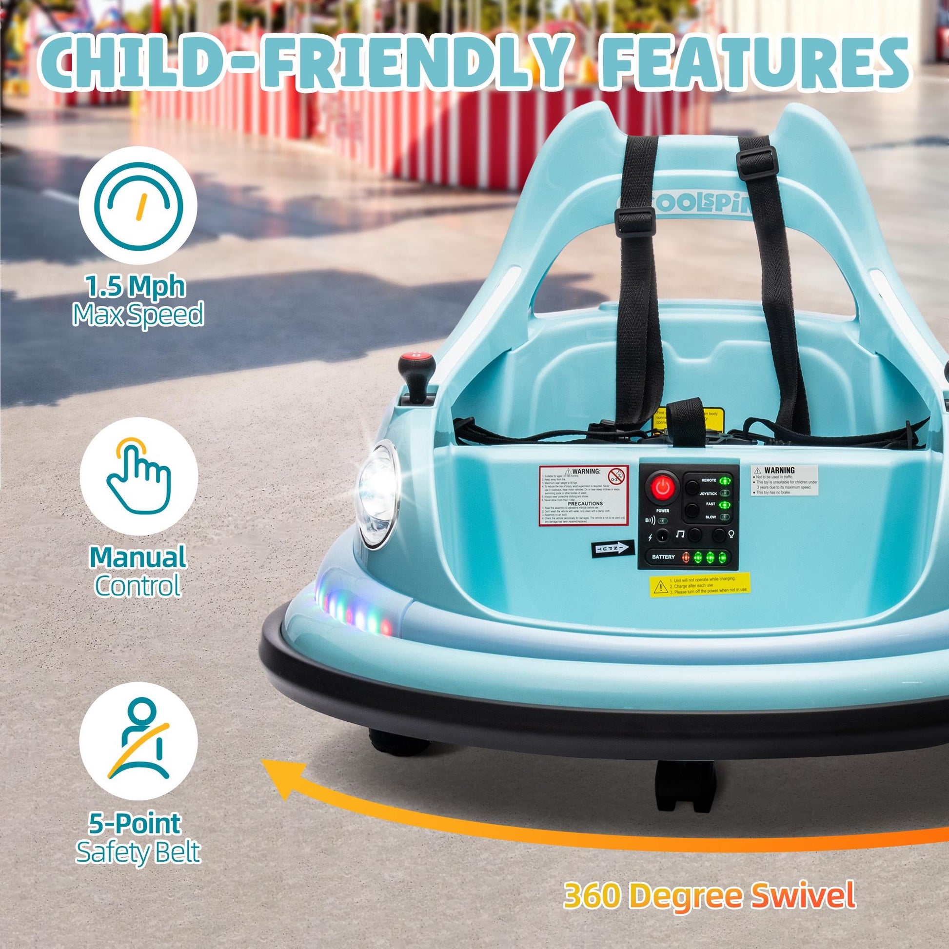 -The safety of your precious child is our top priority. The sturdy plastic shell construction of our children's electric bumper cars ensures long-lasting durability. We use dual 12V batteries (charger included) which provide longer pleasure. Seat belts and soft-start systems provide the perfect blend of fun and safety. Passed ASTM, CPSIA, MSDS, CPC test standards
