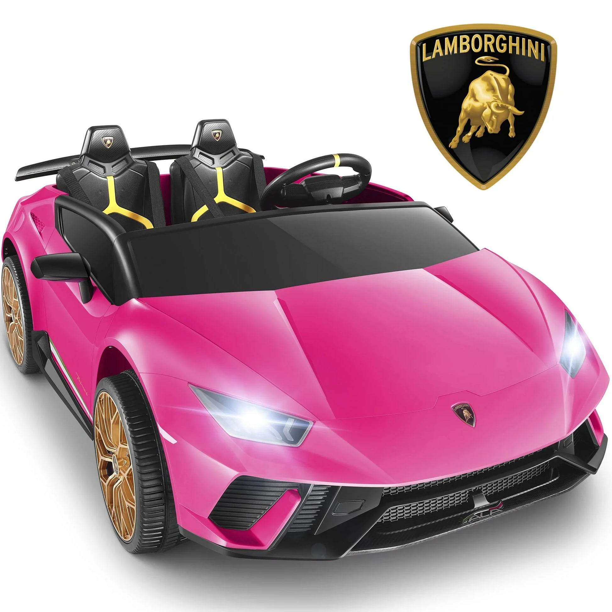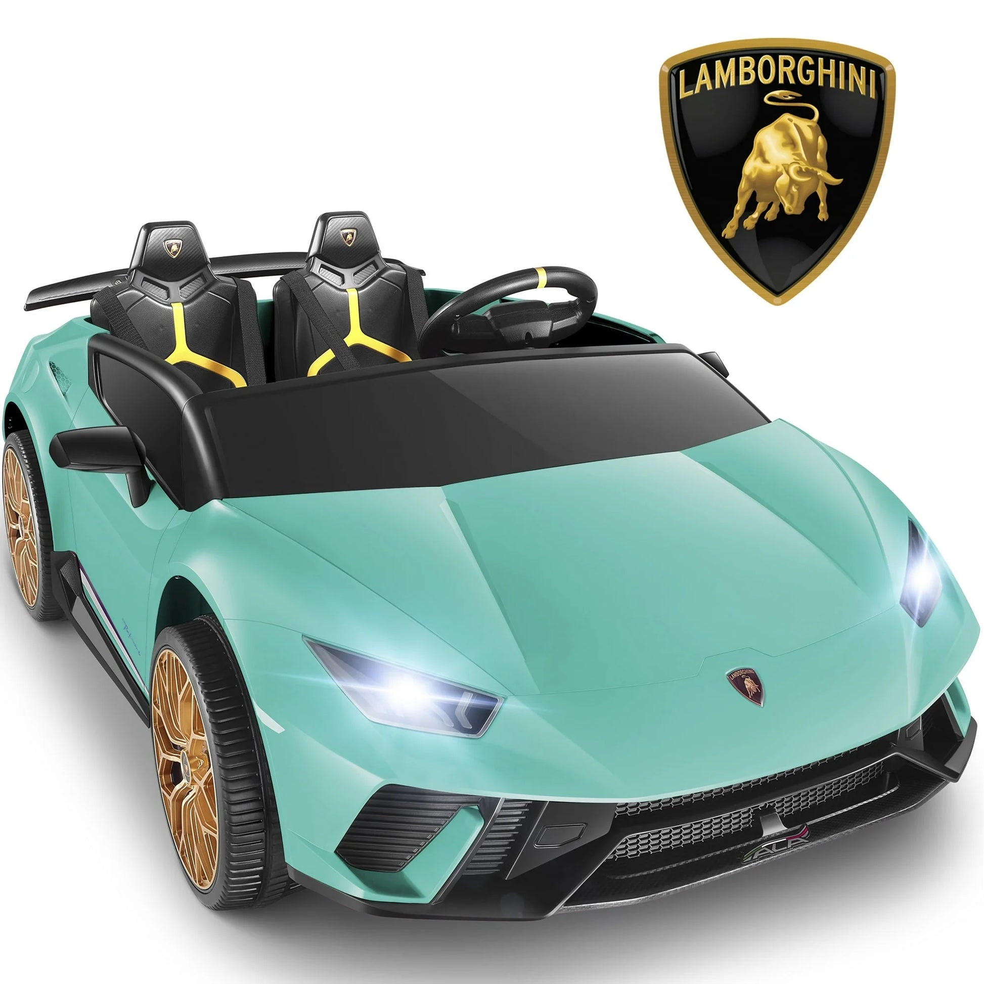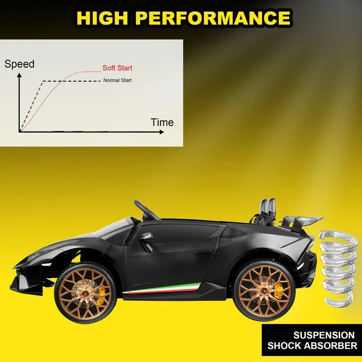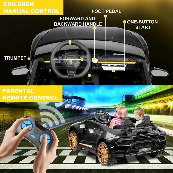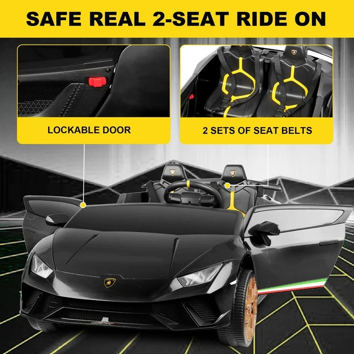 Officially Licensed Lamborghini Huracan 24V Real 2 Seat Ride on Car, it is an exquisite gift for boys and girls that 1 rider aged 3-8 years old or 2 rider aged 3-4 years old. This Lamborghini ride on toy is powered by a 24V7AH battery and comes with a remote control, allowing parents to take charge of the ride if necessary. The electric car features two comfortable seats with the belt, perfect for siblings or friends to enjoy together. This powered vehicle also boasts LED lights, horn buttons, speed switch, and USB interface, mimicking the captivating allure of the real car, adding to the overall immersive driving experience. This electric car comes with a spring suspension system that effectively reduces the impact of bumps on children during driving. Apart from the thrilling ride, children can also enjoy the integrated music, MP3 player, FM Radio and bluetooth function allowing them to listen to their favorite songs while cruising around. With movable auxiliary wheels and handles for easy transportation. This powerful 4WD ride on car not only provides endless fun but also helps improve kids' hand-eye coordination and motor skills. It's an excellent gift choice that combines fun, learning, and luxury.