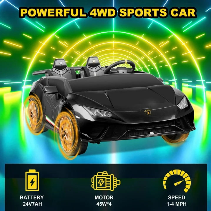 Lamborghini Huracan 24V Powered Ride on Car 2 Seat, 4WD Electric Cars for Kids with Remote Control, Suspension, LED Light, Music, Bluetooth, Children Ride on Toy for 3-8 Years Boys Girls, Black