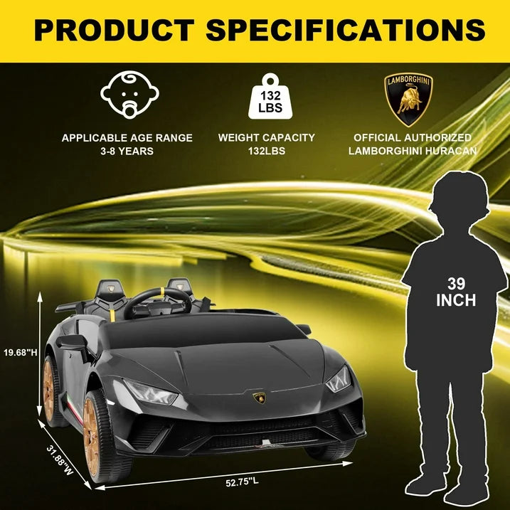【2 SEATER LAMBORGHINI RIDE ON CAR】- Lamborghini Huracan ride on car designed with a spacious 2-seater and max weight capacity of 132 lbs. Powered by a robust 24V 4WD engine, your child can enjoy the endless fun and adventure of riding with their friend, sibling, or even their beloved pet. The ride on car is an exquisite gift for boys and girls that 1 rider aged 3-8 years old or 2 rider aged 3-4 years old, it measures 52.75"L x 31.88"W x 19.68"H.