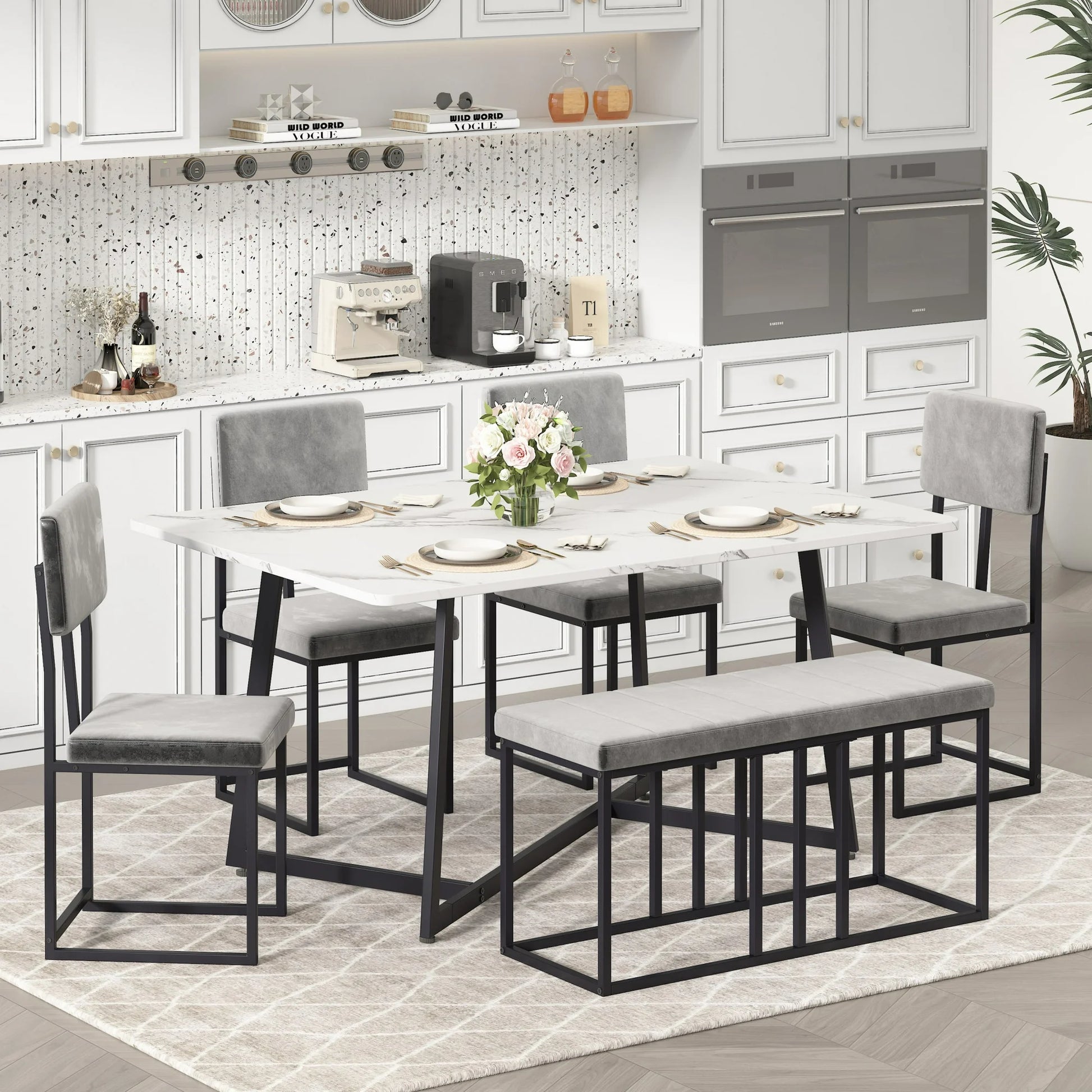 Included are 4 plush upholstered chairs with ergonomic padded seats and a matching bench, the kitchen table set offers flexible seating for up to six, perfect for family dinners, weekend brunches, or entertaining guests.