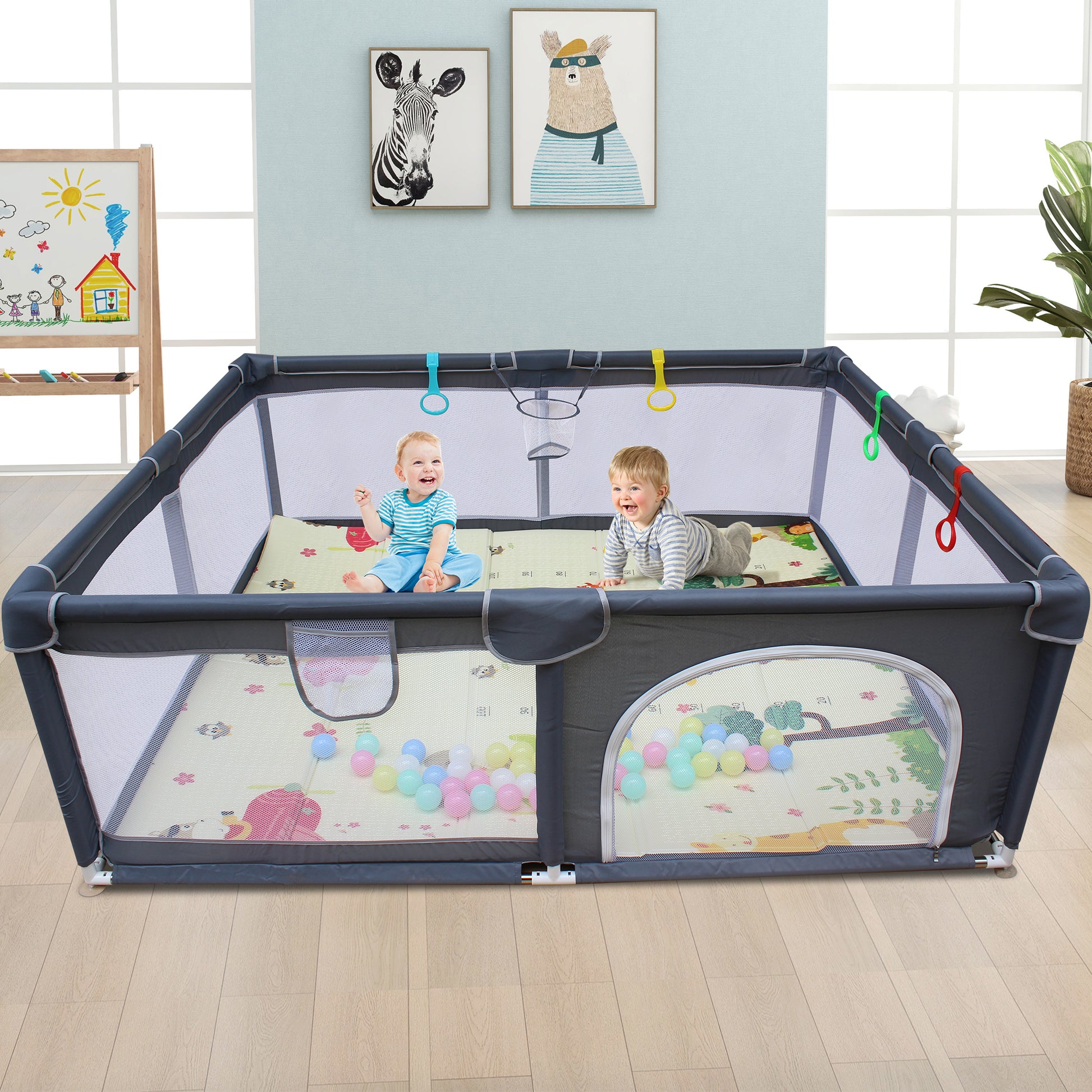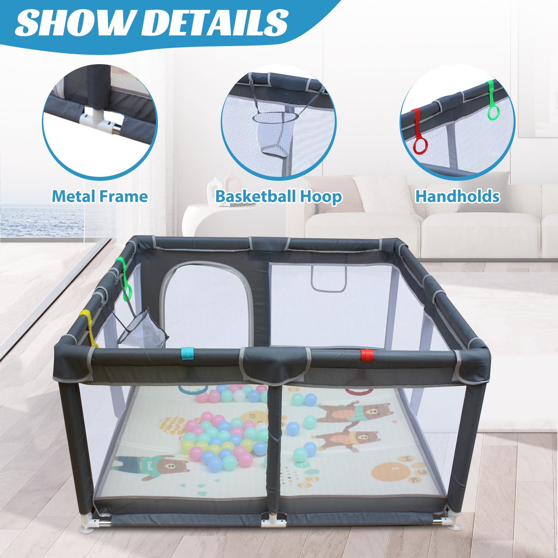 UHOMEPRO Large Baby Playpen Playard with Mat for Toddlers Infant, Safety Baby Fence Yard with Basketball Hoop for Boys Girls, Soft Mesh Walls, 47"×47"/ 71"×59"